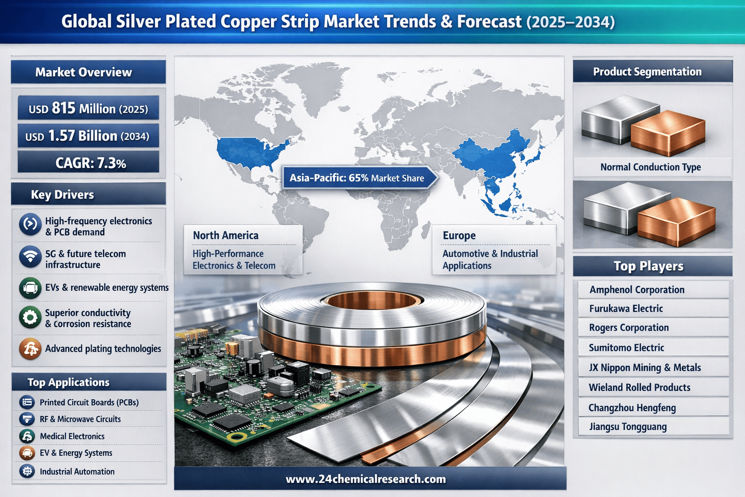 According to 24Chemical Research, Global silver plated copper strip market size was valued at USD 815 million in 2025. The market is projected to grow from USD 892 million in 2026 to USD 1.57 billion by 2034, exhibiting a CAGR of 7.3% during the forecast period.