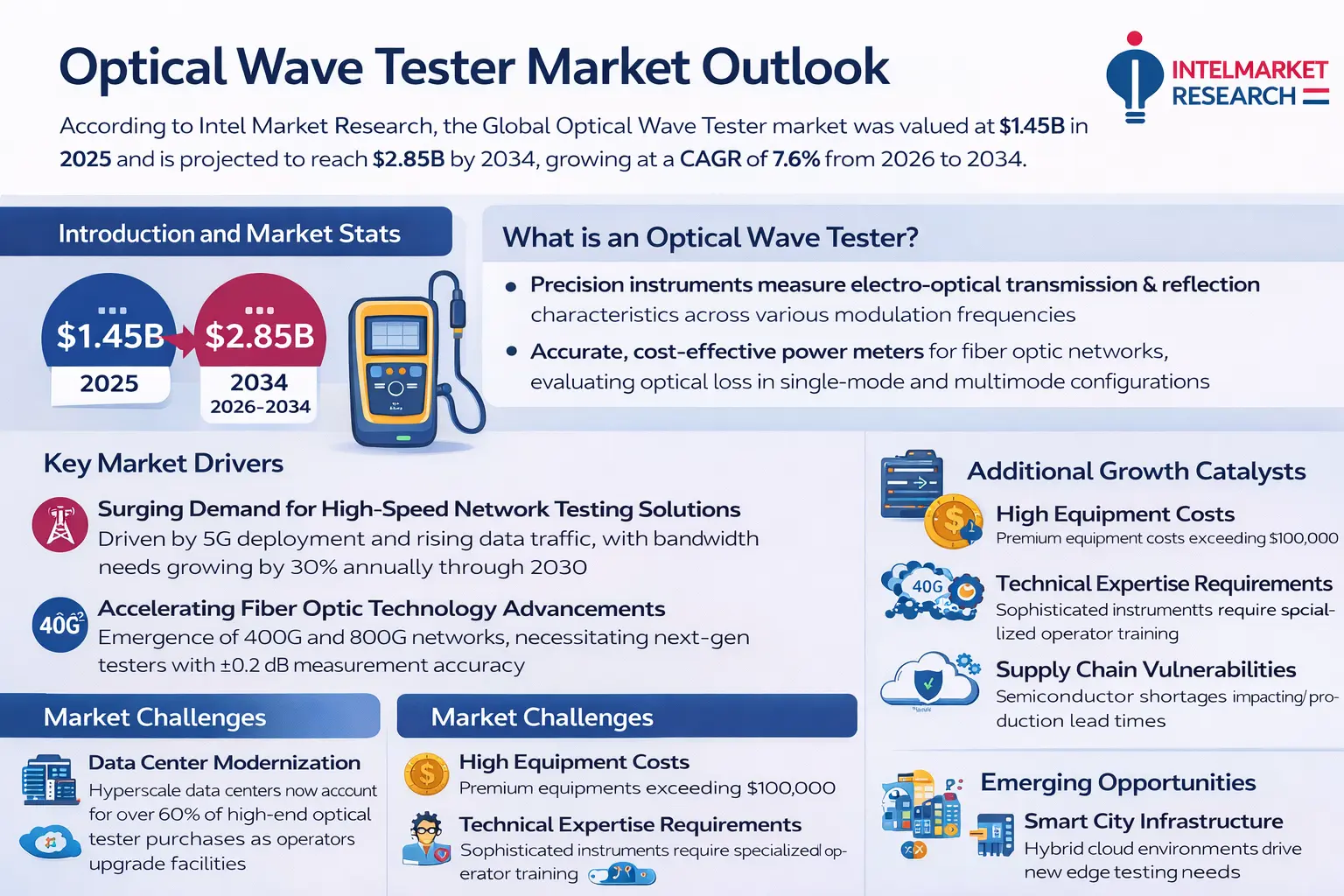 According to a new report from Intel Market Research, Global Optical Wave Tester market was valued at USD 1.45 billion in 2025 and is projected to reach USD 2.85 billion by 2034, growing at a steady CAGR of 7.6% during the forecast period (2026-2034). This growth is fueled by escalating demand for high-speed data transmission capabilities, rapid expansion of fiber optic networks, and significant technological advancements in telecommunications infrastructure.