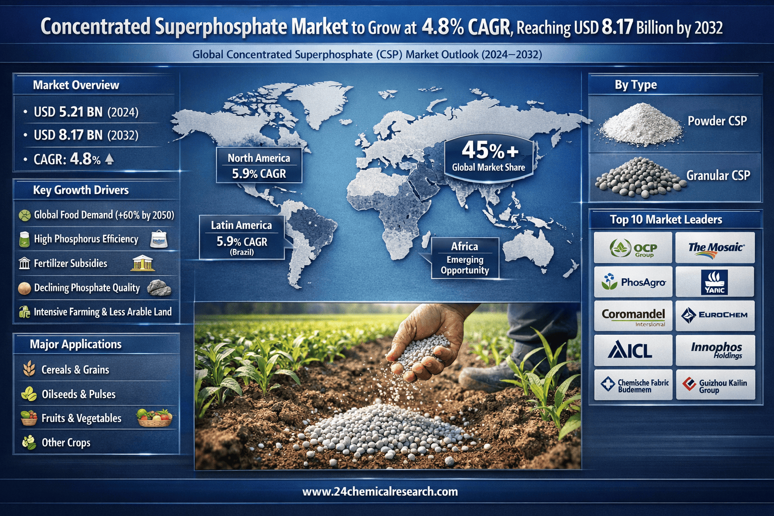 According to 24Chemical Research, Global Concentrated Superphosphate (CSP) market continues to demonstrate robust growth, with a valuation of USD 5.21 billion in 2024. According to the latest industry analysis, the market is projected to grow at a CAGR of 4.8%, reaching approximately USD 8.17 billion by 2032. This growth is fueled by increasing global agricultural productivity demands and the need for high-efficiency phosphate fertilizers that enhance crop yields significantly.