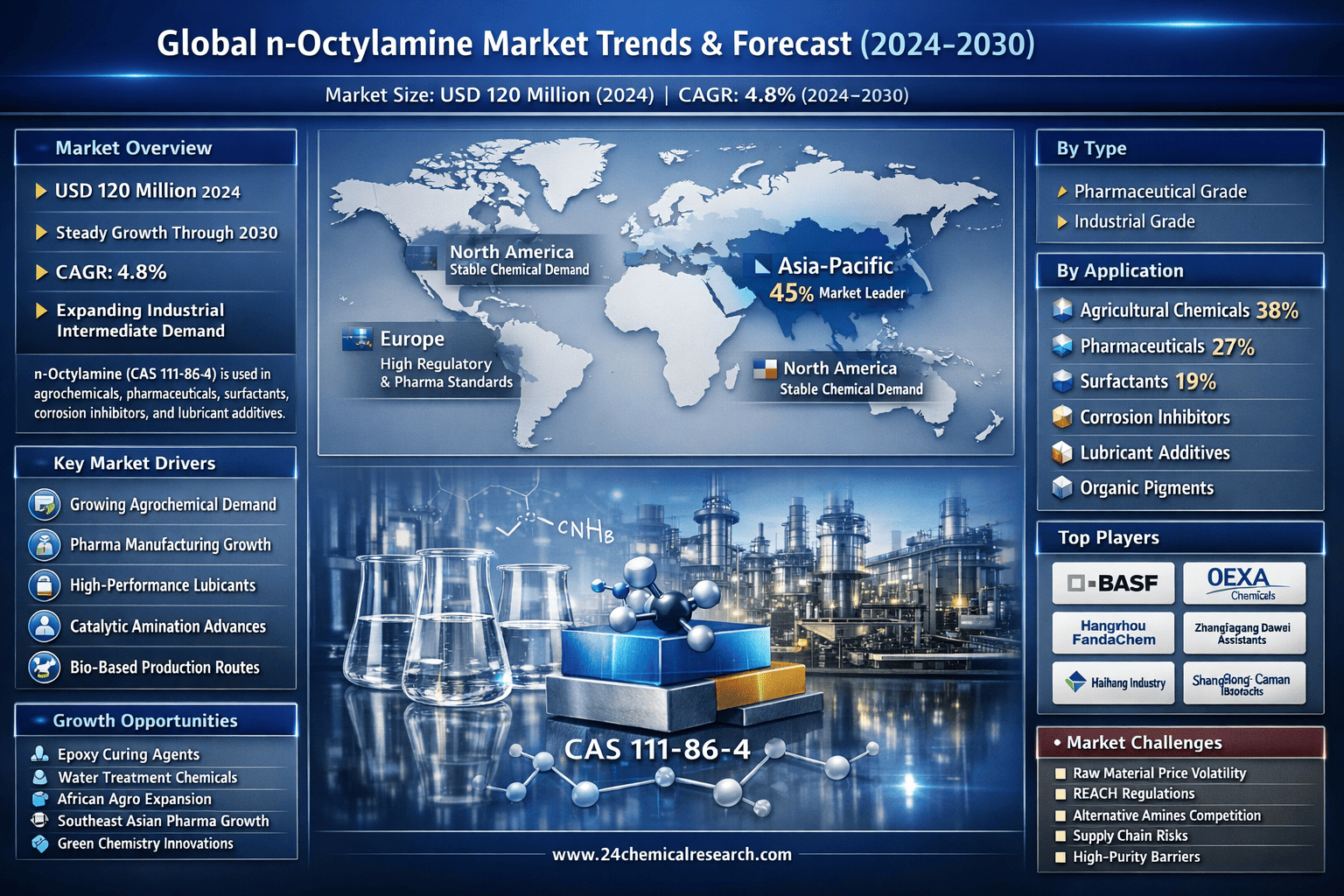 According to 24Chemical Research, Global n-Octylamine market demonstrates steady expansion, with its valuation reaching USD 120 million in 2024. According to latest industry projections, the market is poised to grow at a CAGR of 4.8% during 2024-2030, driven by increasing applications across agrochemicals, pharmaceuticals, and specialty chemicals. The market's growth trajectory reflects the compound's critical role as a chemical intermediate in diverse industrial processes.