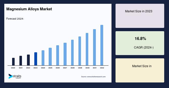 According to StraitsResearch, the global magnesium alloys market size is valued at in 2023 and is estimated to reach by , growing at a CAGR of 16.8% during -.